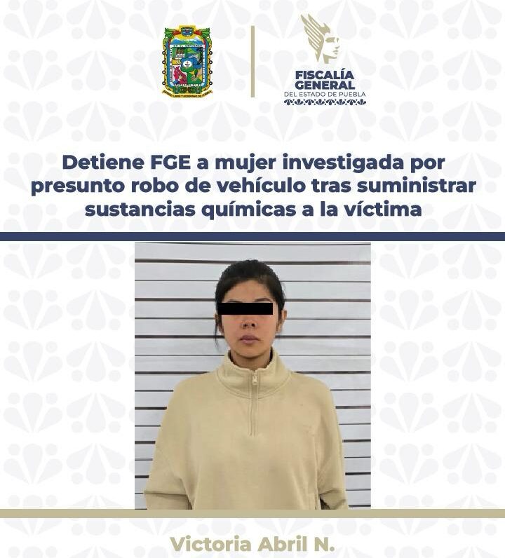La Fiscalía General del Estado de Puebla dio cumplimiento a una orden de aprehensión en contra de Victoria Abril N., por su presunta responsabilidad en el delito de robo de vehículo agravado.