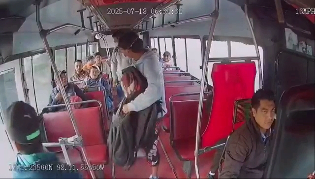Según las imágenes, el vehículo circulaba cerca del cruce de la calle 2 Norte y el Bulevar 5 de Mayo cuando tres sujetos abordaron el colectivo.