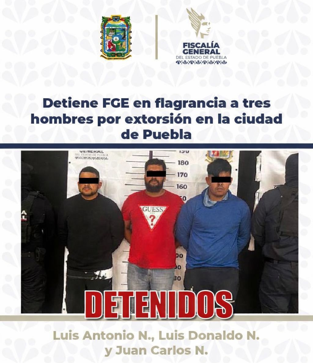 La Fiscalía General del Estado informó sobre la detención de tres presuntos extorsionadores en la capital poblana, cuando cobraban el pago de una de sus víctimas, en un negocio de estructuras metálicas.