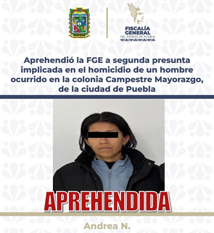 La Fiscalía General del Estado de Puebla informó que, en cumplimiento a una orden de aprehensión emitida por la autoridad judicial, fue detenida Andrea N., a quien se le atribuye su probable participación en el homicidio de un hombre ocurrido el pasado 28 de septiembre en la colonia Campestre Mayorazgo, de la ciudad de Puebla.