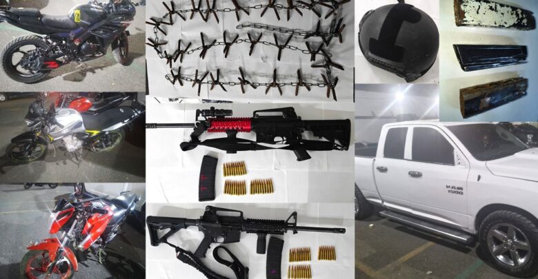 Autoridades estatales confirmaron el aseguramiento de más de 360 cartuchos útiles de distintos calibres, seis armas largas entre ellas una ametralladora, siete cargadores, un casco balístico, equipo táctico y dispositivos de obstrucción vehicular, también conocidos como ponchallantas.