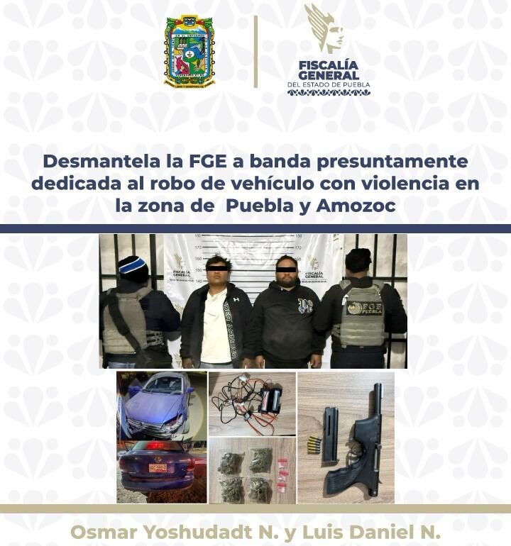 Amozoc, Pue.-La Fiscalía General del Estado desarticuló mediante un operativo a banda delictiva presuntamente dedicada al robo de vehículo con violencia en la zona limítrofe de los municipios de Puebla y Amozoc, operación en la que fueron asegurados Osmar Yoshudadt N. y Luis Daniel N. como probables integrantes.