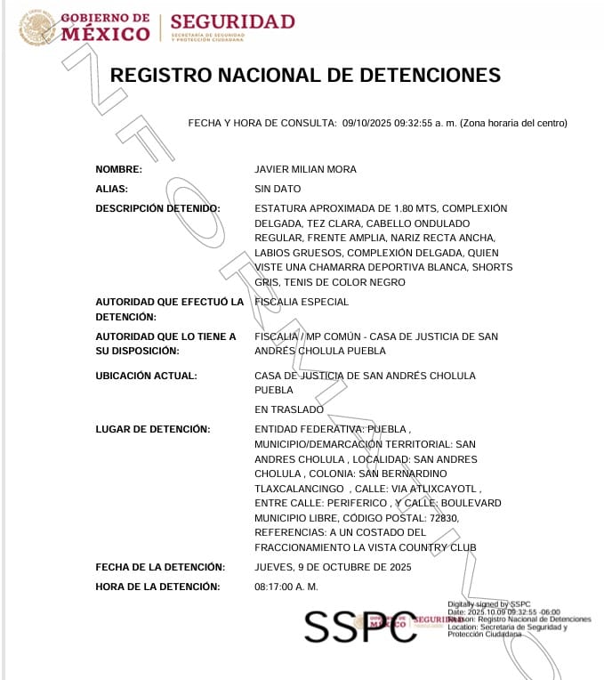 De acuerdo con el Registro Nacional de Detenciones (RND), la hora del aseguramiento fue a las 8:17 horas de este 9 de octubre.