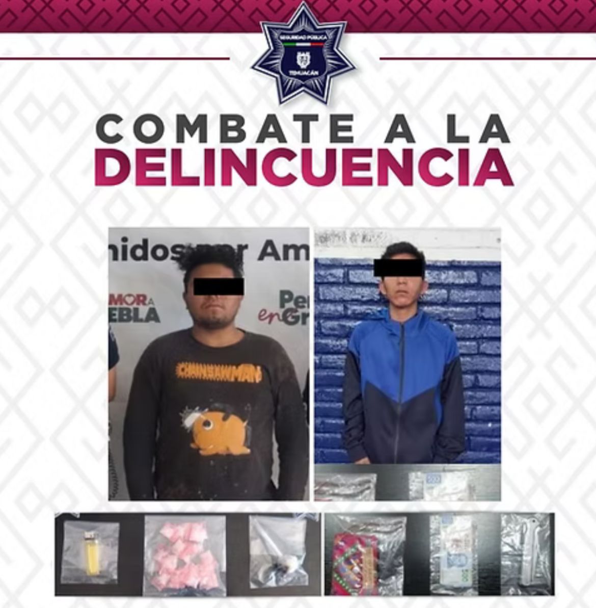 Tehuacán, Pue.-Durante un recorrido interinstitucional elementos policiales lograron la detención, en distintas zonas a Leonardo N. y Abraham N., presuntos integrantes de la banda delictiva conocida como “Los Chimecos”, dedicada al robo y a la venta de drogas en Tehuacán