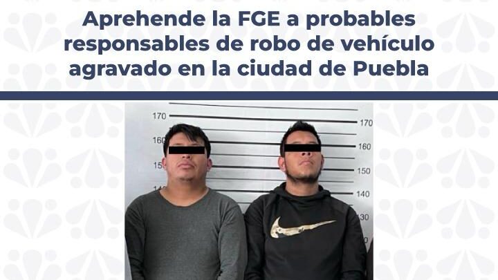 La Fiscalía General del Estado de Puebla logró identificar y detener, mediante orden de aprehensión, a César Alan N. y Luis Norberto N., señalados como presuntos responsables del delito de robo de vehículo agravado ocurrido en la ciudad de Puebla.