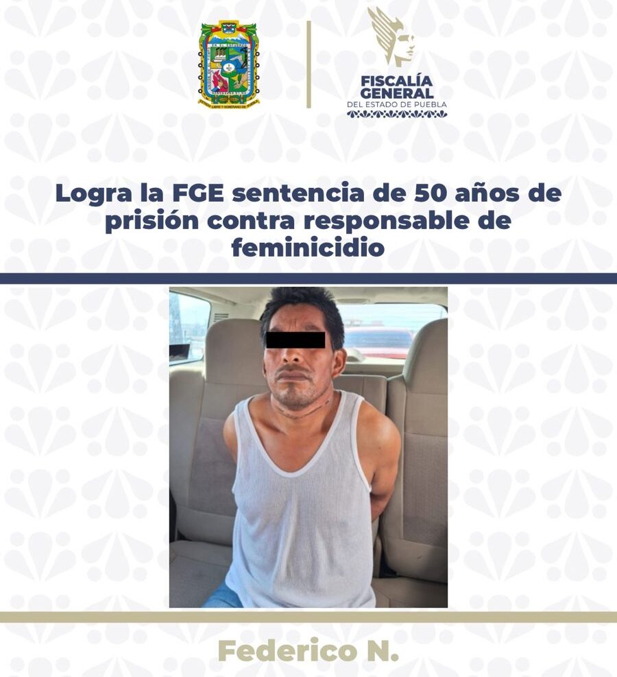 Zacatlán, Pue.-La Fiscalía General del Estado, obtuvo una sentencia condenatoria de 50 años de prisión en contra de Federico N., de 53 años de edad, tras acreditar de manera plena su responsabilidad penal en la comisión del delito de feminicidio, cometido en el municipio de Zacatlán.