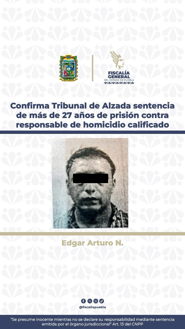 El Tribunal de Alzada confirmó la sentencia de primera instancia con base en los argumentos vertidos por la Fiscalía General del Estado, en contra Edgar Arturo N., quien permanecerá más de 27 años en prisión, por su responsabilidad penal en el delito de homicidio calificado, en agravio de un hombre en la ciudad de Puebla.