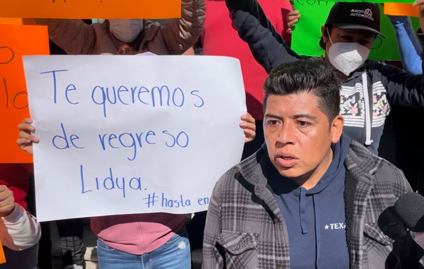 Afuera de la Fiscalía General del Estado, Luis Andrés apareció acompañado de sus Familiares y amigos de la comunidad de Apango quienes lo rodearon con pancartas y gritaban consignas como Luis, te apoyamos, Luis te acompañamos en la búsqueda de Lidya y tu bebé