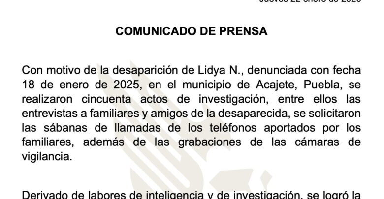 Fue derivado de trabajos de inteligencia e investigación que las autoridades poblanas lograron ubicar a Lidya Valdivia este 22 de enero, alrededor de las 16:00 horas, en el municipio de Tepetixtla, Estado de México.