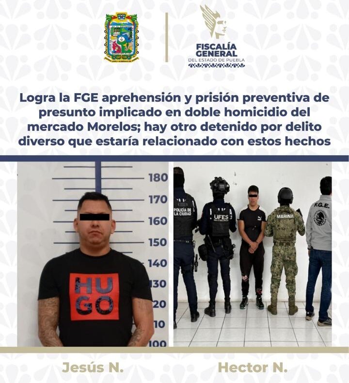 Puebla, Pue.-La Fiscalía General del Estado de Puebla, con apoyo de las Secretarías de Marina (SEMAR) y Seguridad Ciudadana de Puebla (SSC), cumplieron con una orden de aprehensión en contra de Héctor N., quien se encuentra con prisión preventiva tras presuntamente estar implicado en el homicidio de dos personas cuyos cuerpos fueron localizados en el Centro de la ciudad de Puebla; además hay otro detenido quien también estaría relacionada con estos hechos.