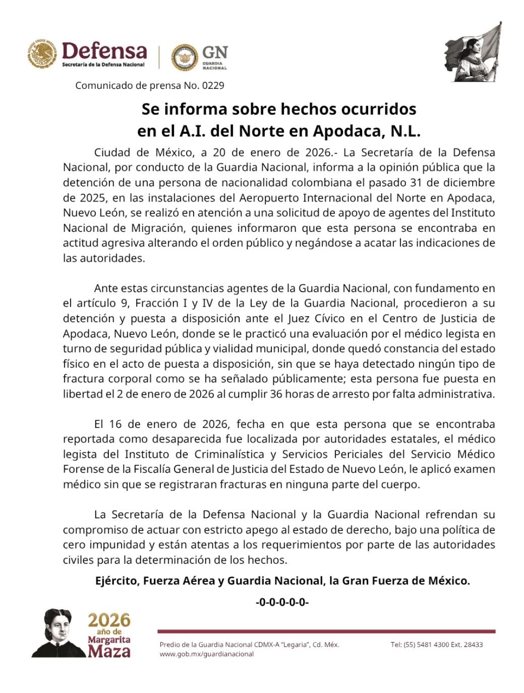 Ciudad de México.- La Secretaría de la Defensa Nacional, a través de la Guardia Nacional, informó sobre los hechos ocurridos en el Aeropuerto Internacional del Norte, en Apodaca, Nuevo León, relacionados con la detención de Leonardo Ariel Escobar Barrios, profesor de la Ibero Puebla de origen colombiano el pasado 31 de diciembre de 2025.
