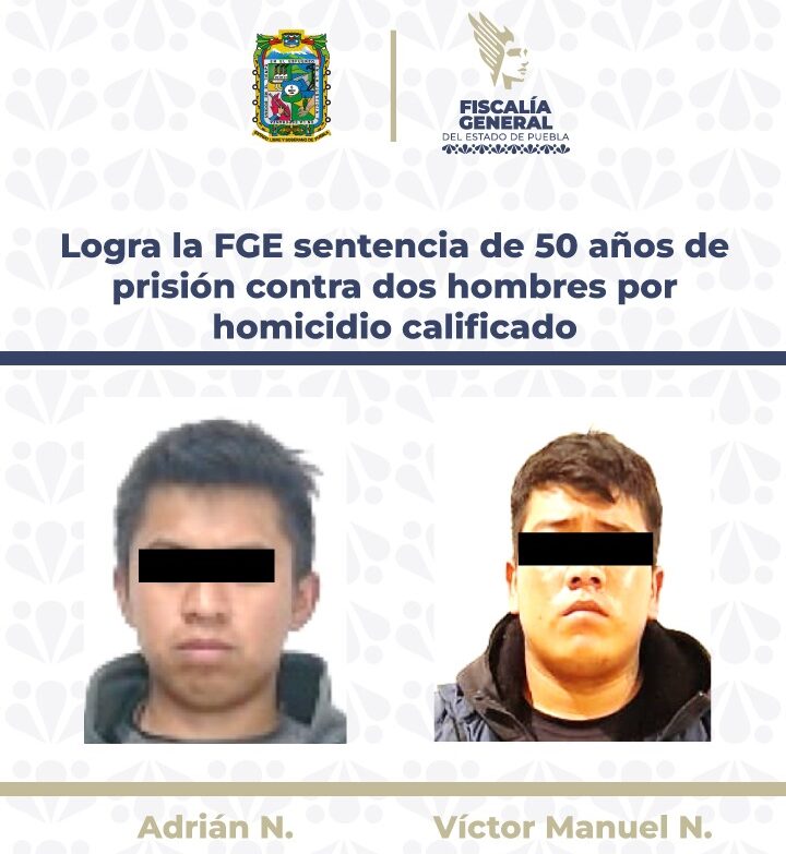 La Fiscalía General del Estado de Puebla, a través del trabajo realizado por el Ministerio Público, logró obtener una sentencia de 50 años de prisión en contra de Adrián N. y Víctor Manuel N., al acreditar su responsabilidad penal en la comisión del delito de homicidio calificado.
