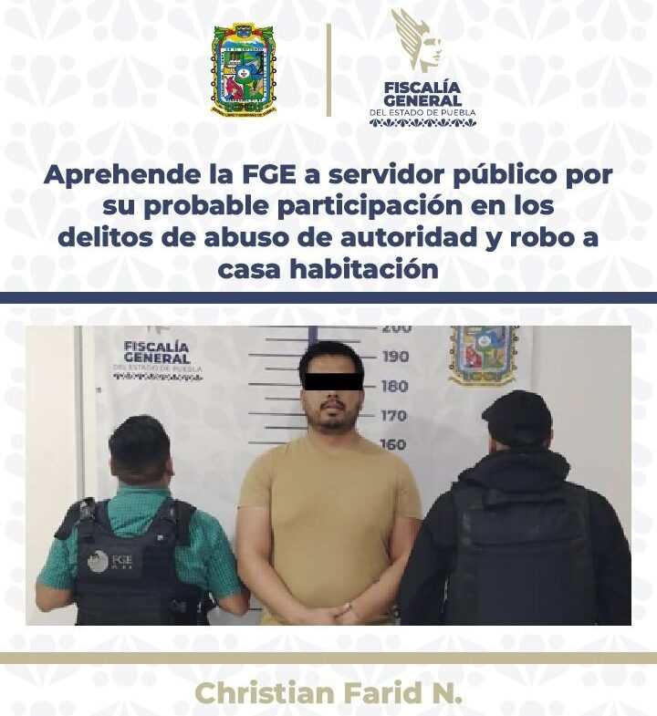 Puebla, Pue.- La Fiscalía General del Estado cumplió una orden de aprehensión en contra de Christian Farid N., de 33 años de edad, quien se desempeñaba como agente ministerial, por su probable responsabilidad en la comisión de los delitos de abuso de autoridad y robo a casa habitación.