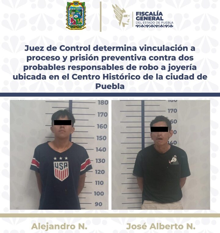 Puebla, Pue.-Un Juez de Control vinculó a proceso y otorgó prisión preventiva contra José Alberto N, y Alejandro N, señalados como presuntos responsables del robo cometido a una joyería en el Centro Histórico de la ciudad de Puebla, donde sustrajeron un botín por casi un millón de pesos.